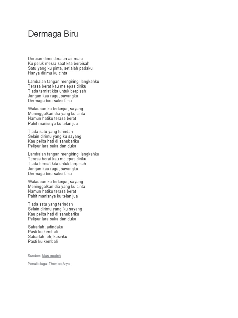 Lambaian tangan mengiringi langkahku Terasa berat kau melepas diriku Tiada terngiang kita untuk berpisah Jangan kau ragu sayangku Dermaga biru saksi bisu Walaupun. Dermaga Biru deraian demi deraian air mata ku peluk mesra saat kita berpisah satu yang ku pinta setialah padaku hanya dirimu ku cinta. Lagu Dermaga Biru diliris pada tahun 2022 merupkan ciptaan Thomas Arya.